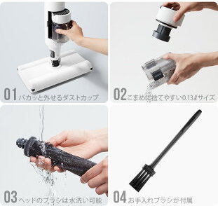 ゴミもパカッとダストカップが取り外せて、先端のブラシも取り外して水洗いOK。
