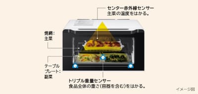 容器を含む食品の表面温度をはかる「センター赤外線センサー」と容器を含む食品の重さをはかる「重量センサー」が働いて、Webレシピ集に掲載の「1回で作れる分量」の範囲内ならどんな分量でも重さと温度をはかって、火加減を自動で調節してくれます。