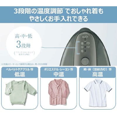 温度調整も高・中・低の3段階で、「高(約160℃)」は綿、麻などに、「中(約140℃)」はポリエステル、レーヨン、ウールなどに、「低(約110℃)」はベルベット、シルク、アクリルなどデリケートな生地にそれぞれ使い分けられます。
