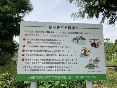 池沿いの注意書きを読むと、釣り台の持ち込み自体はOKみたいですが、設置は禁止で、長時間放置されているものは撤去するとありました。