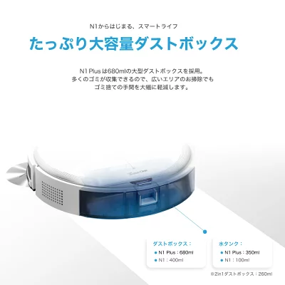 N1Plusはダストボックスも水タンクも大容量になり、作動時間も長くバッテリーにも差があります。
