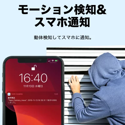 防犯カメラとしても、見守りカメラとしても必要な機能、動いたら察知してくれるモーション検知とそれをスマホにお知らせしてくれる機能も搭載しています。